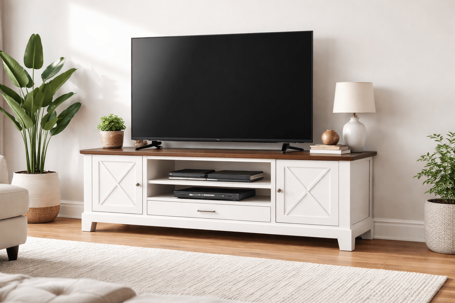 A practical TV unit designed for modern living rooms. Features a brown veneer surface, two enclosed cabinets, open shelving, and a storage drawer. Sized 150cm x 40cm x 55cm and requires simple assembly.