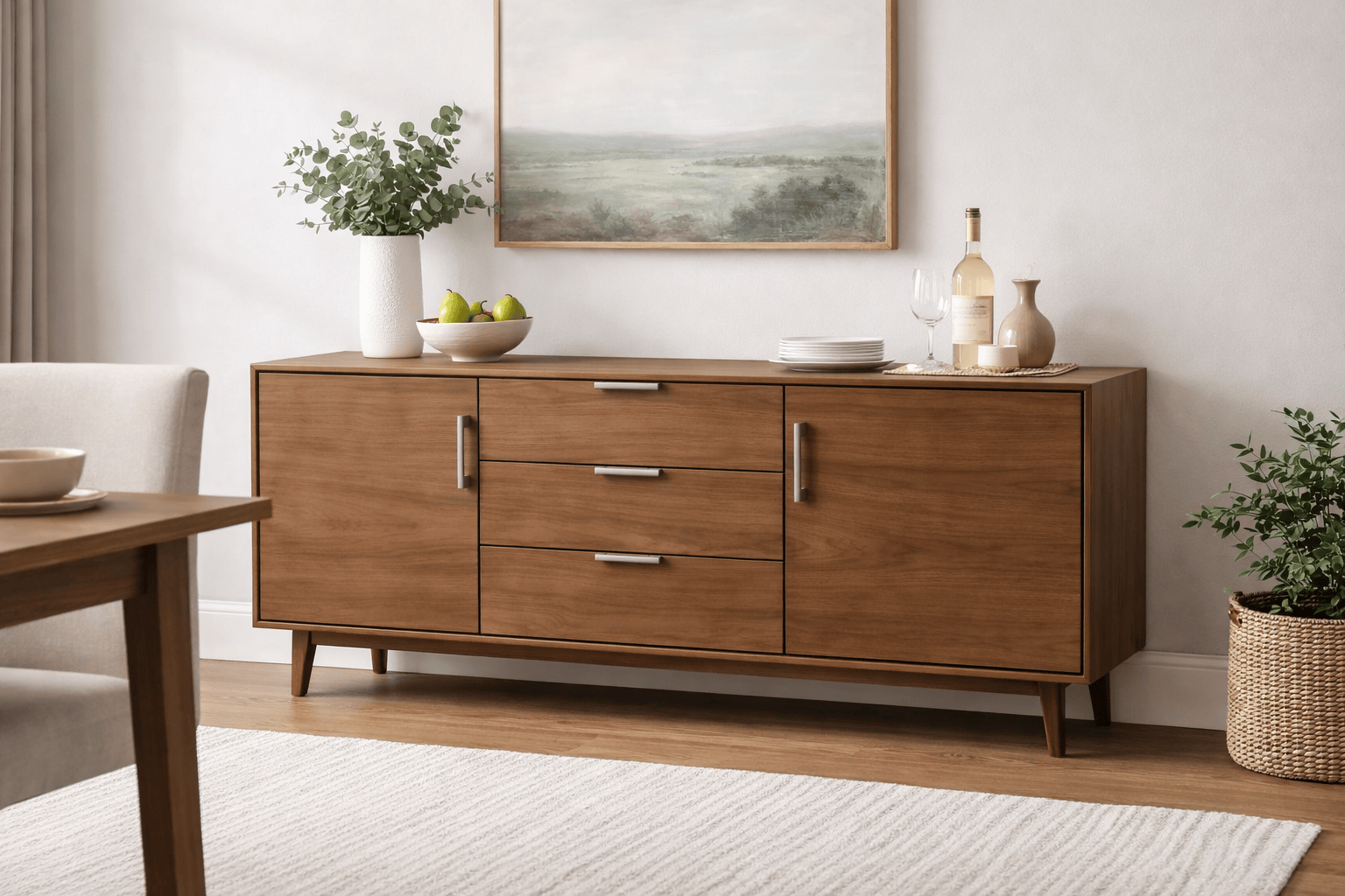 A functional sideboard with a walnut veneer finish, offering two cabinets and three centre drawers for organised storage. Suitable for dining rooms, living rooms or hallways.
